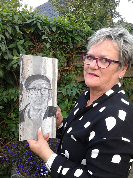 Vijftien jaar geleden, na een bezoek aan Amerika, waar ze leegheid voelde en het niet verbonden zijn, maakte de kunstenaar een serie prachtige foto’s van Tolberter boeren, mensen van wie de familie generaties lang met de grond en de omgeving was verbonden. Dit voorjaar besloot ze de doorleefde koppen opnieuw uit te werken door ze te schilderen, in zwart/wit, op oud zink. De karakteristieke portretten hebben sterk aan zeggingskracht gewonnen. Ze zijn prachtig!